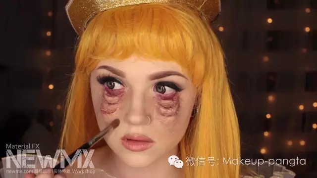 将红眼水滴在眼睛内,做出红血丝的效果。到这里妆容就完成了。