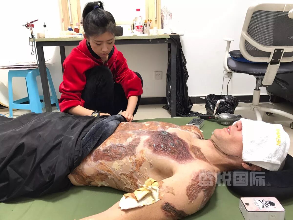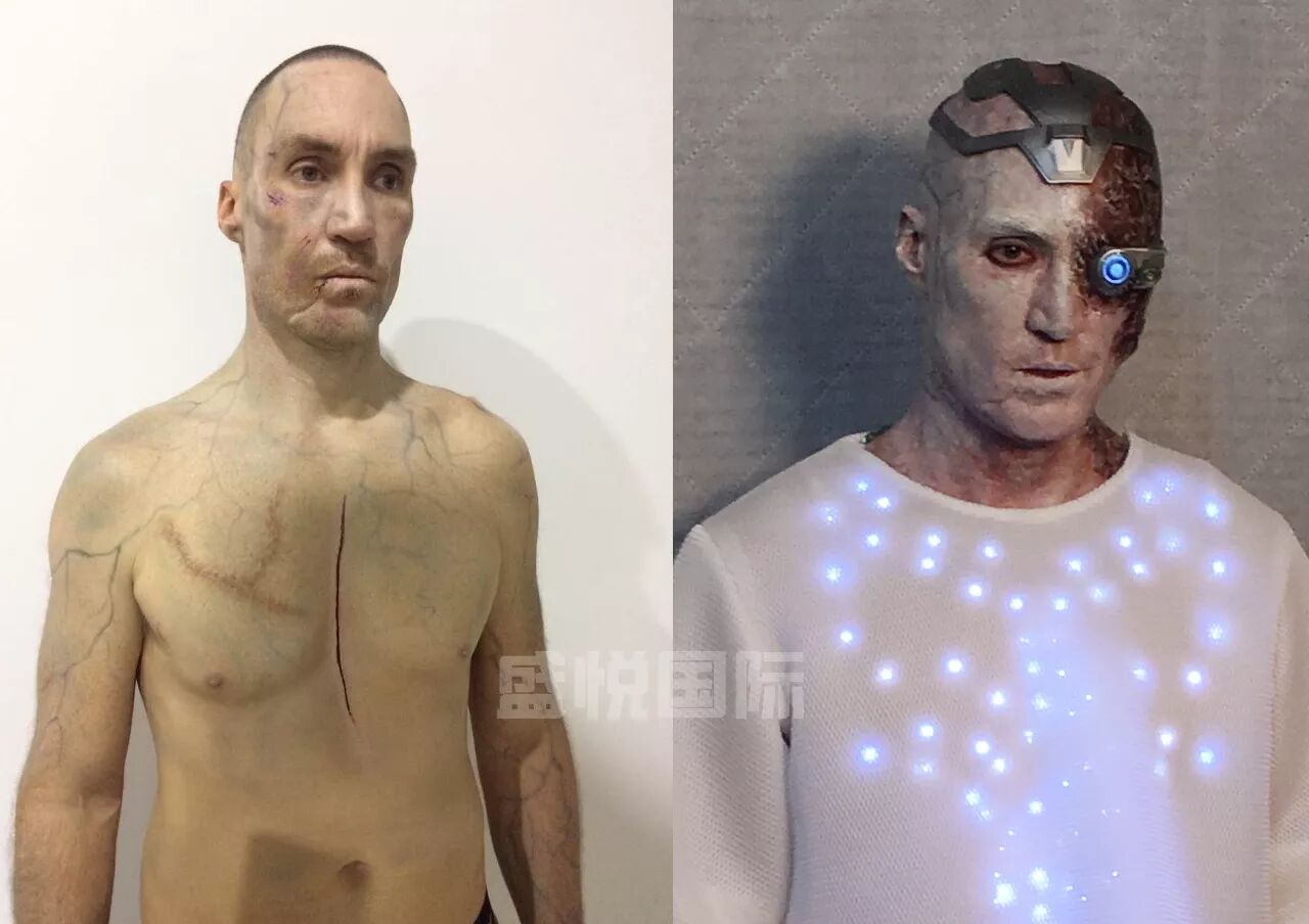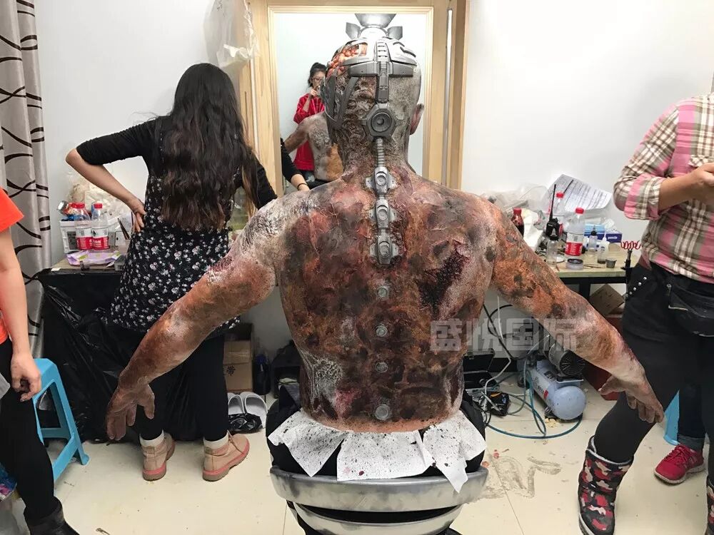 从“生化人”的形象随着故事的发展后续面部的烧伤、变异,再到打斗中全身的烧伤。整个角色有三个阶段的特效化妆造型变化。