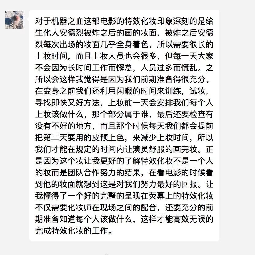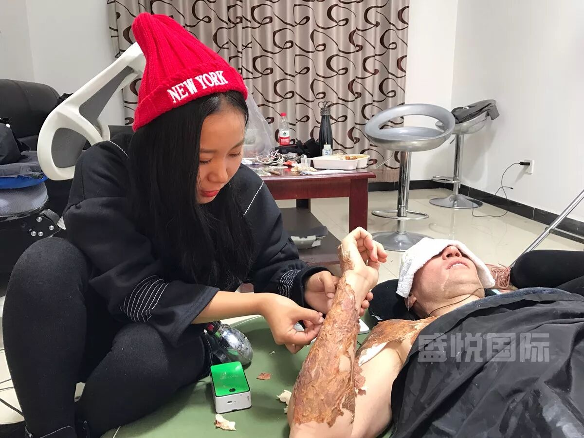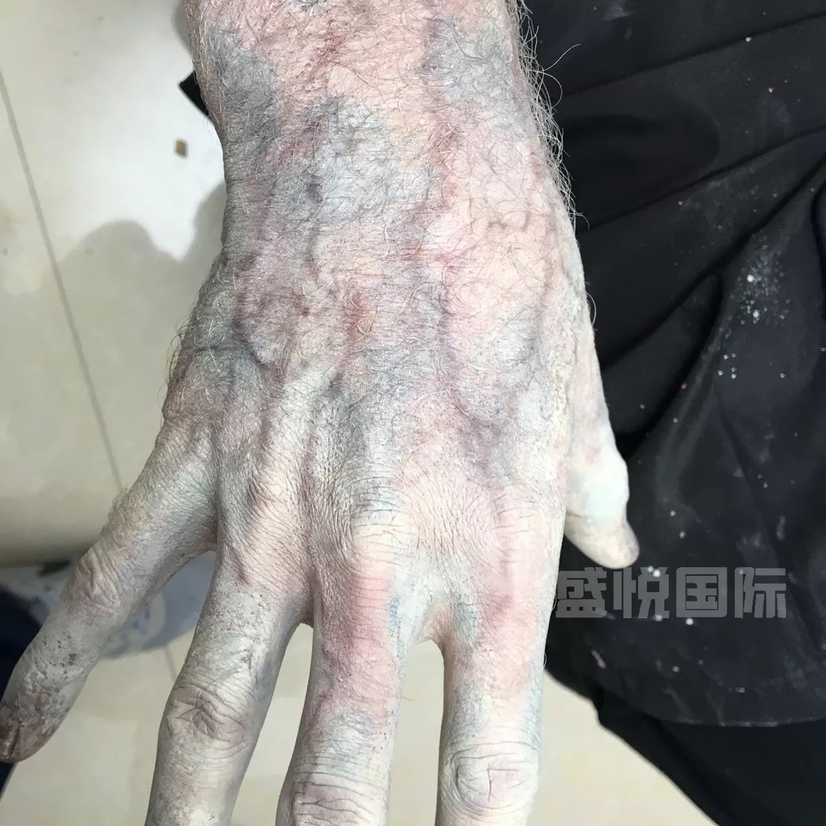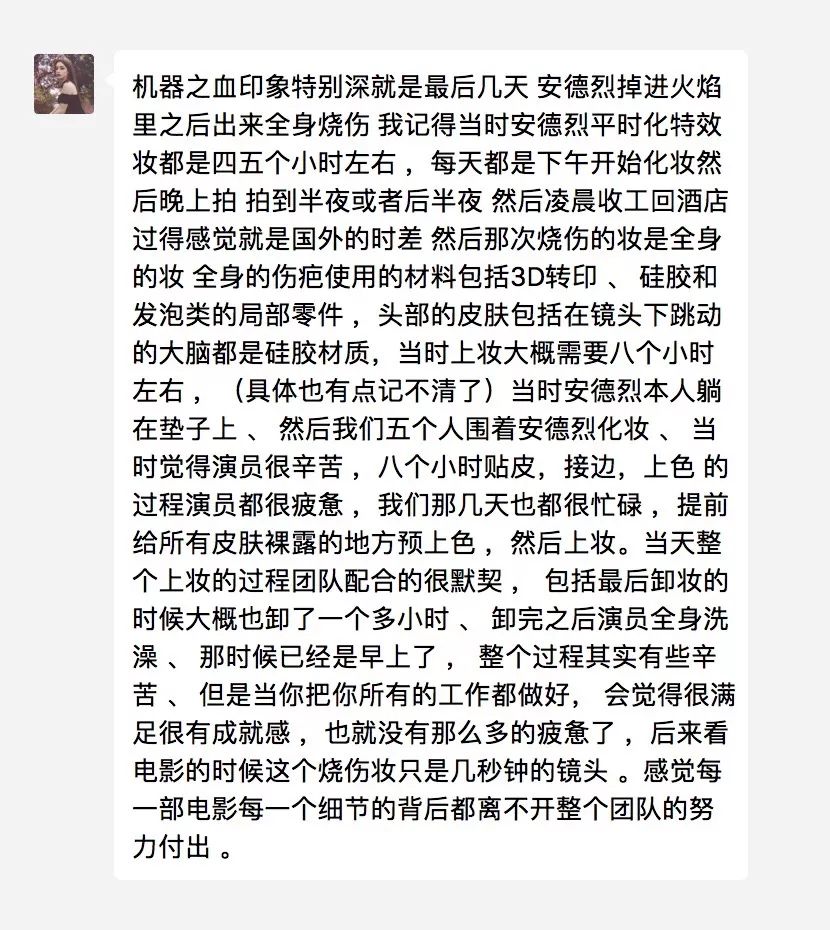 从“生化人”的形象随着故事的发展后续面部的烧伤、变异,再到打斗中全身的烧伤。整个角色有三个阶段的特效化妆造型变化。