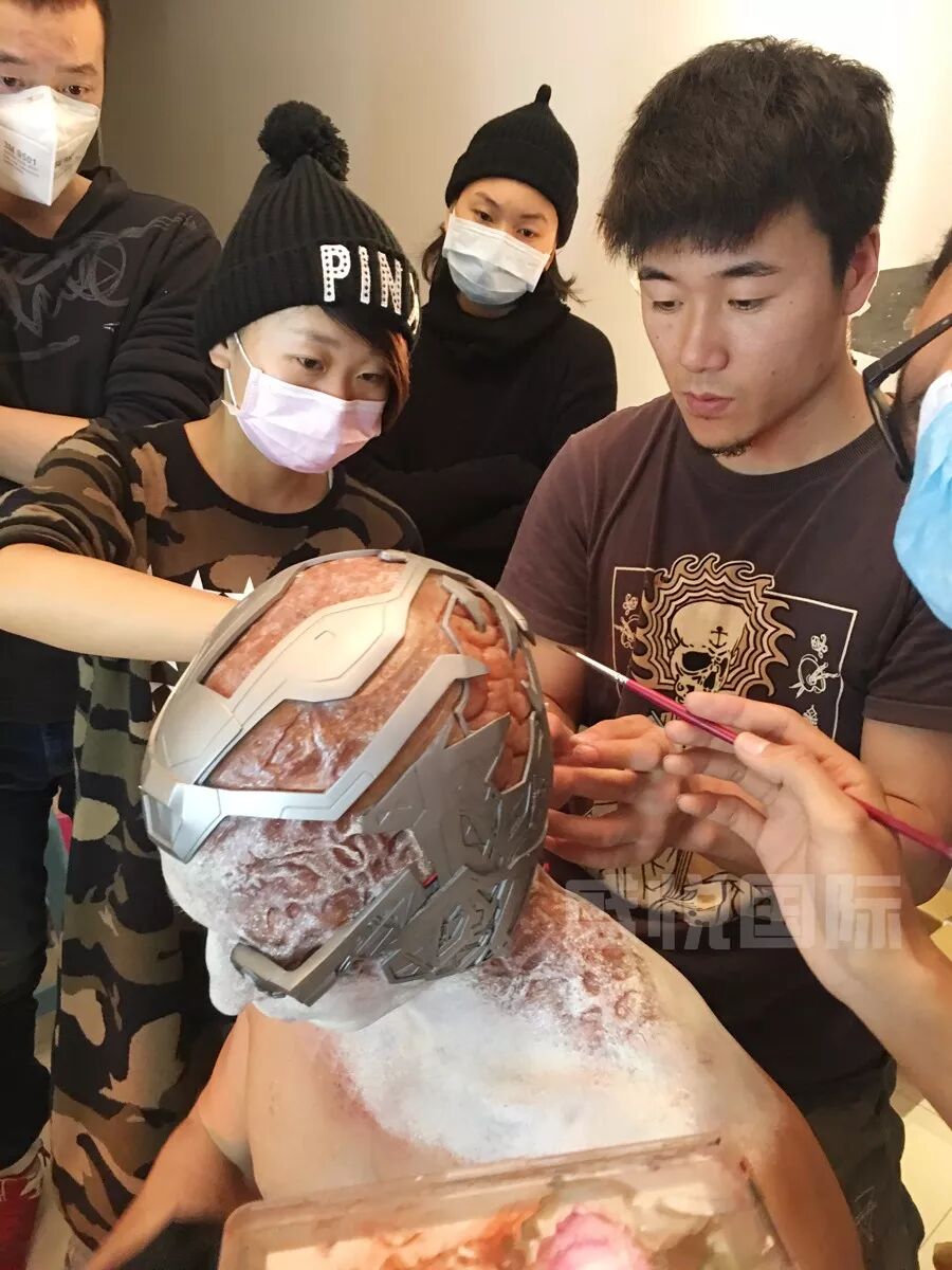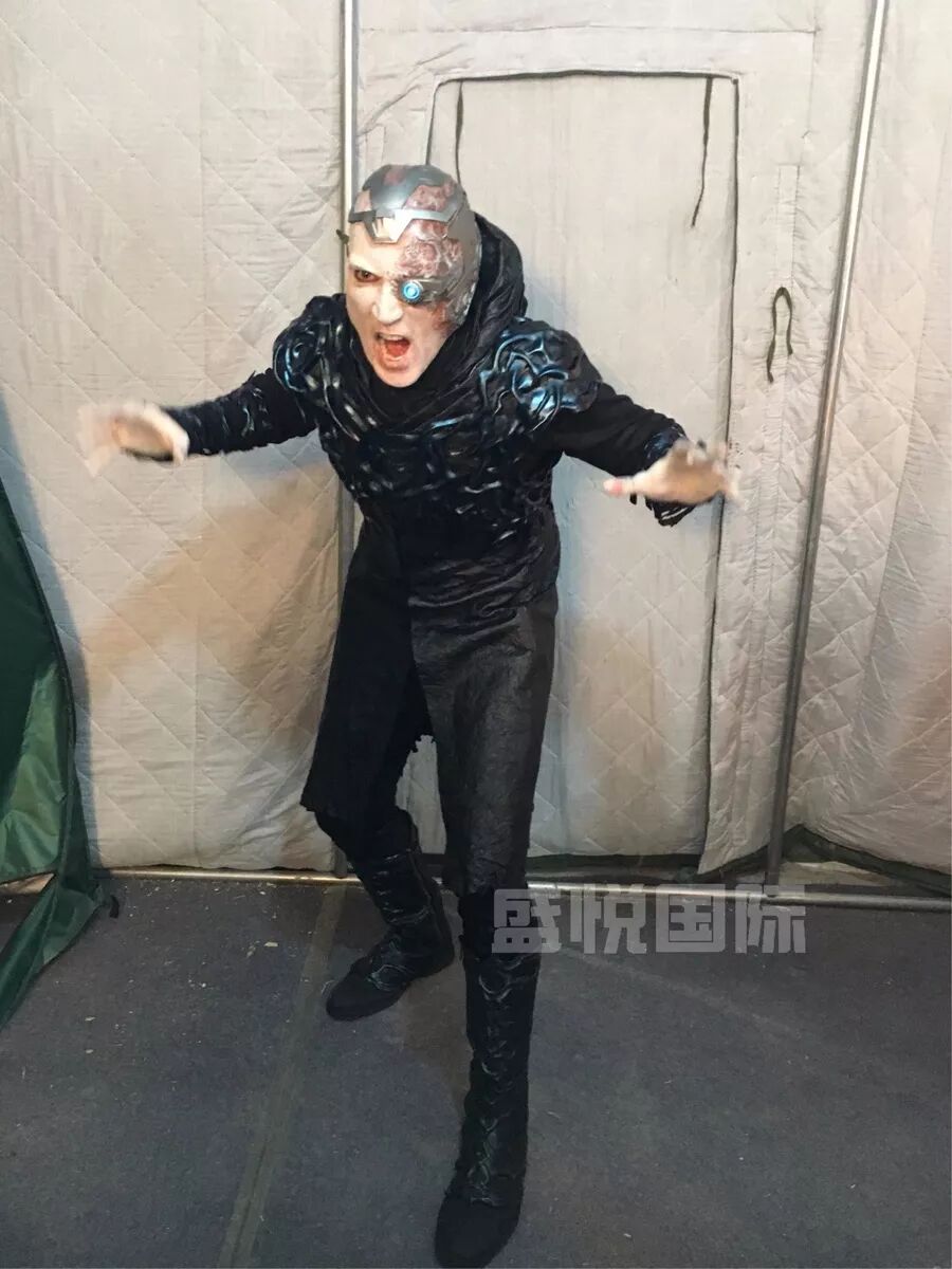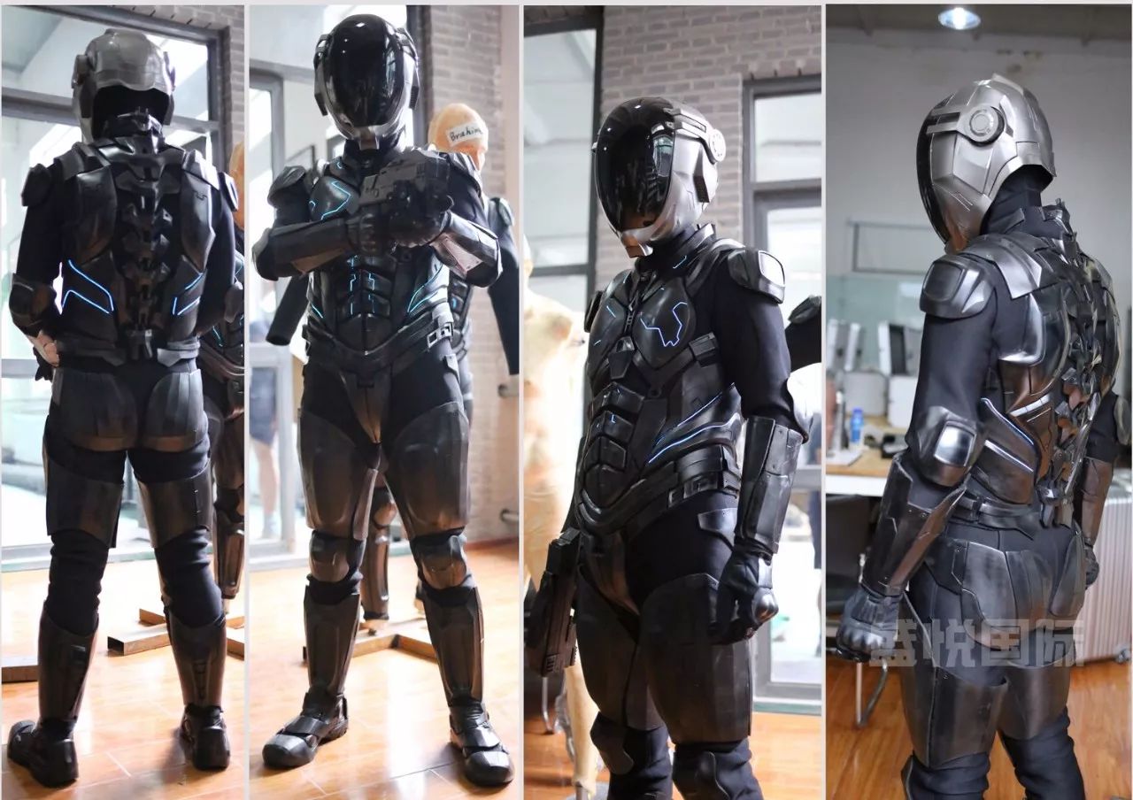 科幻元素的机甲服装在质感上有“金属质地”的视觉体现,当影片是以打斗内容为主的拍摄过程中为了不影响演员在动作上的表演;为了解决这一技术问题我们在机甲服装材质的选择上做出了十几种材料的对比;造型制作上结合3维设计,采用特殊雕塑工艺,完成整套造型的机甲零件,可控制的头盔及全黑的整体形象中加入线条型光感,每个细节的完全考究设计原型而为演员身型量身定制。